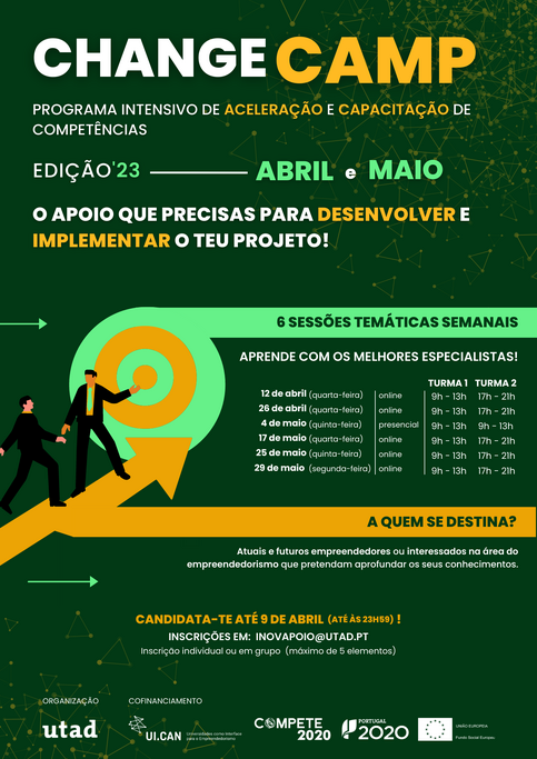 A Universidade de Trás-os-Montes e Alto Douro (UTAD), no âmbito do projeto UI-CAN – Universidades como Interface para o Empreendedorismo, promove entre este mês de abril, e no próximo de maio, o ChangeCamp 2023, um Programa Intensivo de Aceleração de Ideias de Negócio, em formato online. As inscrições estão abertas até às 23h59 do dia 9 de abril de 2023.