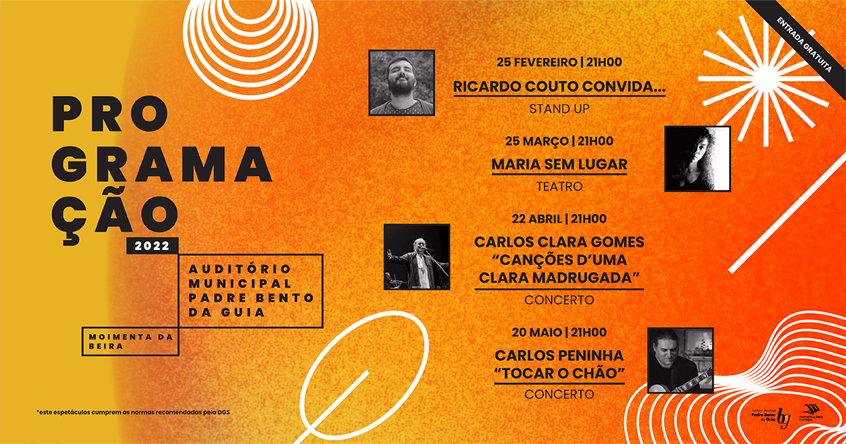 Depois de Ricardo Couto, seguem-se mais três momentos culturais até maio, um por mês: “Maria sem lugar”, teatro, em março, dia 25; “Canções d’uma clara madrugada”, por Carlos Clara Gomes, concerto, em abril, dia 22; e “Tocar o Chão”, por Carlos Peninha, concerto, em maio, dia 20. Todos com início às 21 horas e todos de entrada gratuita, com levantamento do bilhete na Biblioteca Municipal, sempre no início da semana de cada um dos espetáculos.