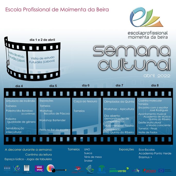 Está a decorrer até dia 8 de abril a Semana Cultural na Escola Profissional de Moimenta da Beira, sediada na Quinta do Ribeiro, na freguesia de Vila da Rua. O evento, cujo programa começou com uma visita de estudo à Futurália, em Lisboa, na sexta e sábado passados, 1 e 2 de abril, e prosseguiu esta segunda-feira, dia 4, terminando no próximo sábado, dia 8, abrange um conjunto de atividades desportivas, de lazer, um encontro com o escritor José Rodrigues, olimpíadas, exposições, workshops, noite de fados, entre muitas outras.