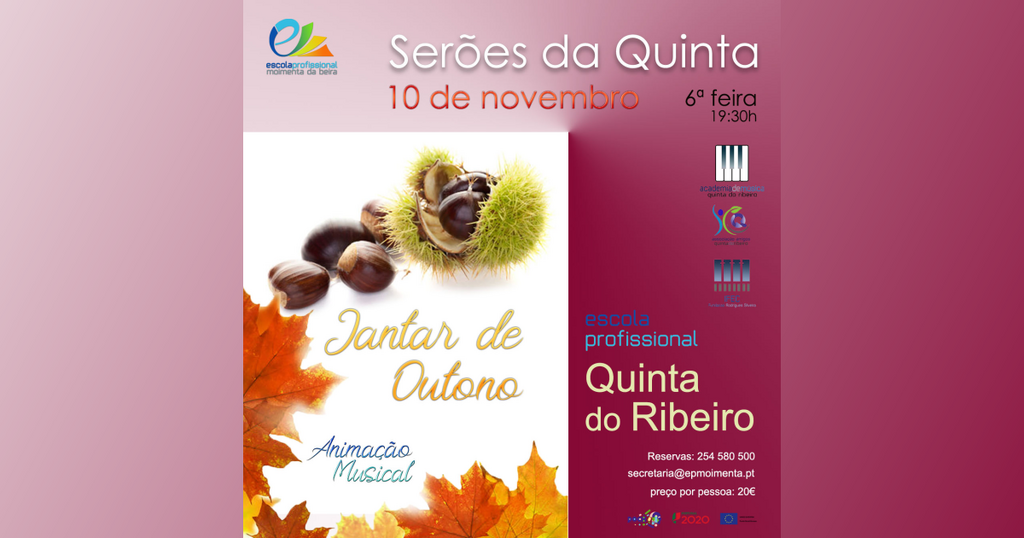 A Escola Profissional de Moimenta da Beira vai promover na próxima sexta-feira, dia 10 de novembro, mais uma edição dos “Serões da Quinta” com um jantar de Outono. O evento vai decorrer nas instalações da escola, em Vila da Rua, Moimenta da Beira, a partir das 19h30, e contará como sempre com animação musical.