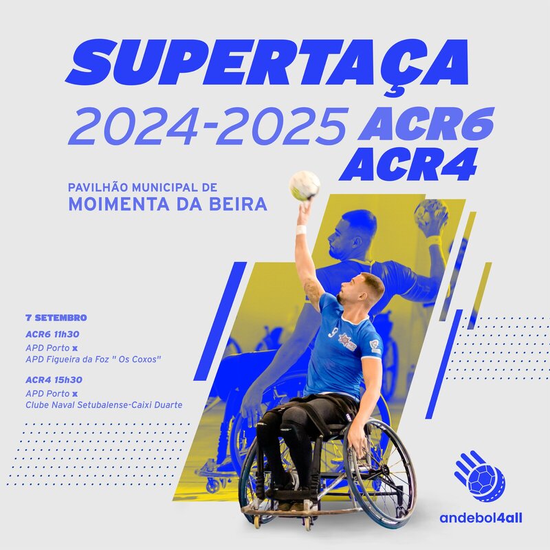 No próximo dia 7 de setembro, o Pavilhão Municipal de Moimenta da Beira vai receber dois jogos de Supertaças de Andebol em Cadeiras de Rodas (ACR). O primeiro, marcado para as 11h30, põe em confronto as equipas de ACR6 da APD Porto x APD Figueira da Foz “Os Coxos”, e o segundo, às 15h30, as formações de ACR4 da APD Porto x Clube Naval Setubalense – Caixi Duarte.