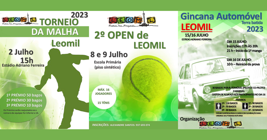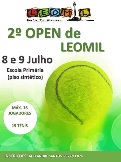 Já nos dias 8 e 9 de julho, será o piso sintético do campo de jogos da Escola Primária a receber o 2º Open de Leomil. O torneio de ténis é limitado a 16 jogadores com as inscrições a decorrer.