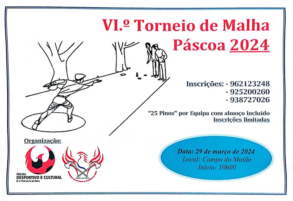 O Campo do Matão, em Moimenta da Beira, vai receber no próximo dia 29 de março, dia feriado de Sexta-Feira Santa, às 10 horas, o VI Torneio de Malha Páscoa 2024. Para participar no evento, os interessados devem inscrever-se ligando para os contactos telefónicos: 962 123 248; 925 200 260 ou 938 727 026.