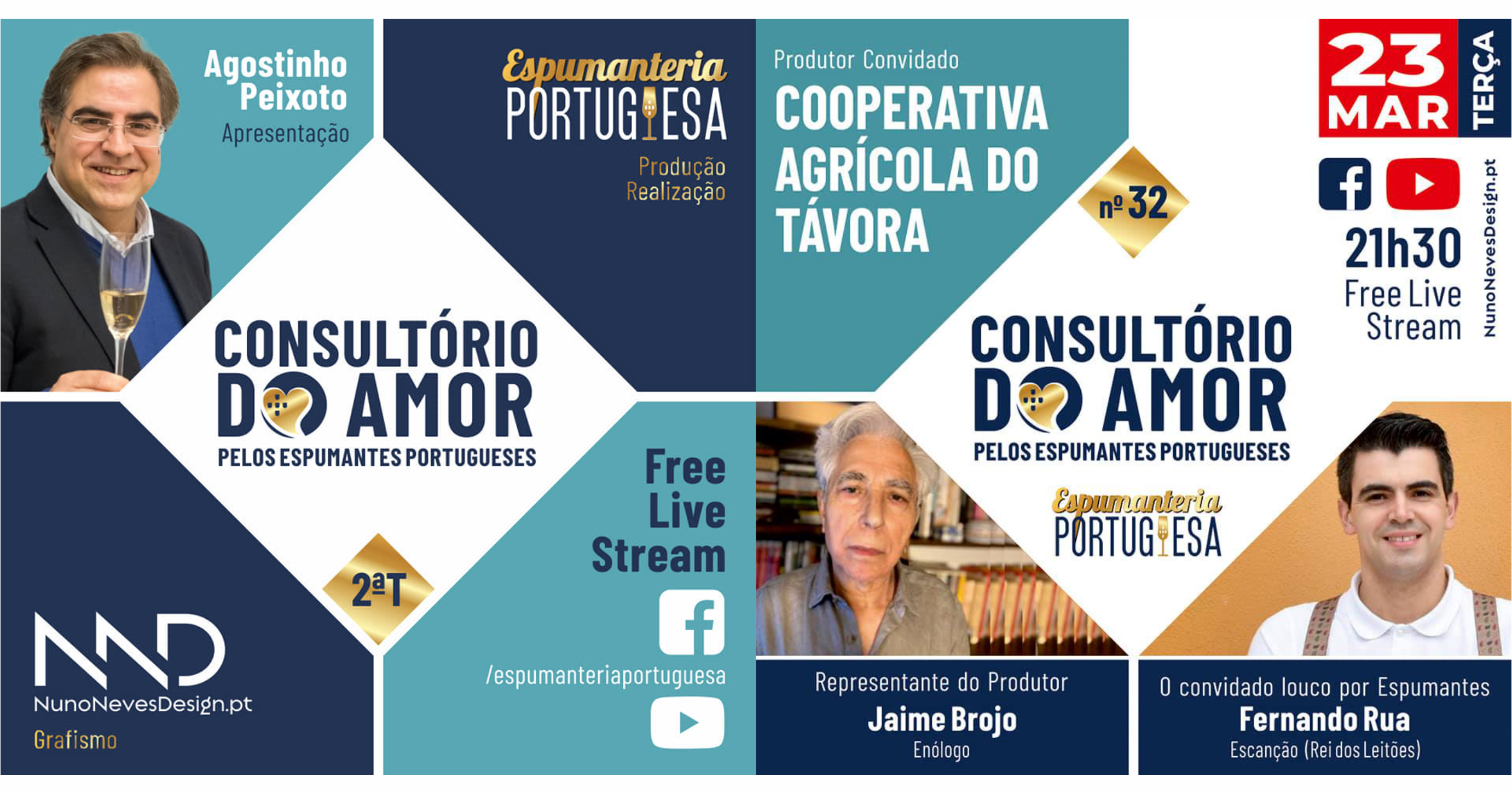 Jaime Brojo, enólogo da Cooperativa Agrícola do Távora, sediada em Moimenta da Beira, que produz os espumantes Terras do Demo, é o convidado do programa “Consultório do Amor”, do projeto empresarial “Espumanteria Portuguesa”, de Agostinho Peixoto, que será transmitido online (free live stream) via página de facebook e canal do youtube esta terça-feira, 23 de março, a partir das 21h30.
