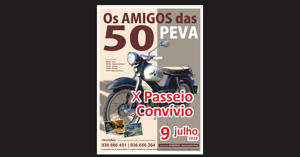 “Os Amigos das 50”, que é como quem diz “os amigos dos veículos motorizados cuja cilindrada não exceda os 50 cm3”, realizam no próximo dia 9 de julho, que é um domingo, o “X Passeio Convívio”, com partida em Peva, Moimenta da Beira.