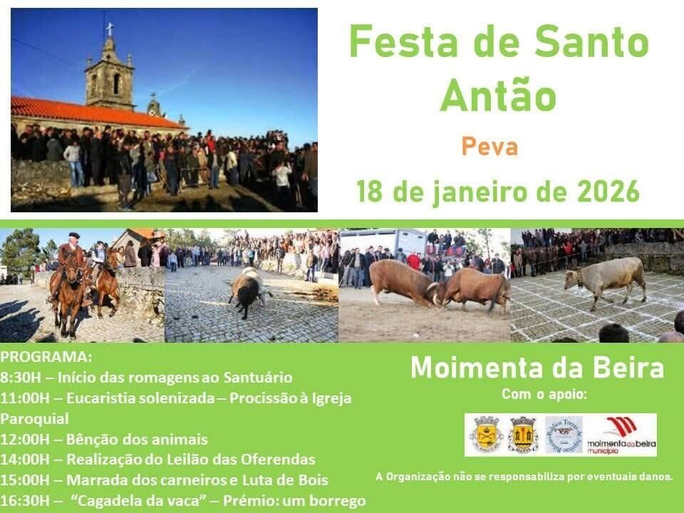 As tradicionais festas em honra de Santo Antão vão realizar-se em Peva, Moimenta da Beira, no dia 18 de janeiro. O programa, volta a ser preenchido por tradições populares, características singulares como a marrada de carneiros, a luta de bois, o jogo da cagadela da vaca e a bênção dos animais, não fosse Santo Antão o padroeiro supremo dos animais.