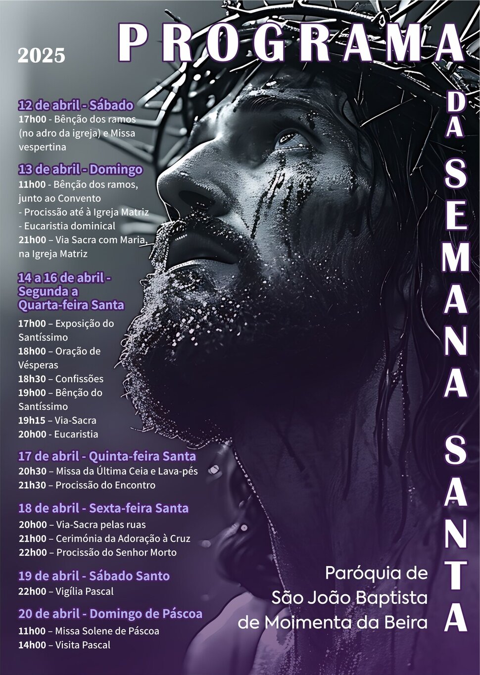 Eis o programa das celebrações da Semana Santa na Paróquia de São João Baptista, em Moimenta da Beira. A intensa semana que recorda os últimos dias da vida terrena de Cristo tem início no próximo sábado 12 de abril, às 17 horas, com Bênção dos ramos (no adro da igreja) e Missa vespertina, e termina no Domingo de Páscoa, dia 20, com a Missa Solene às 11 horas, e Visita Pascal a partir das 14 horas.