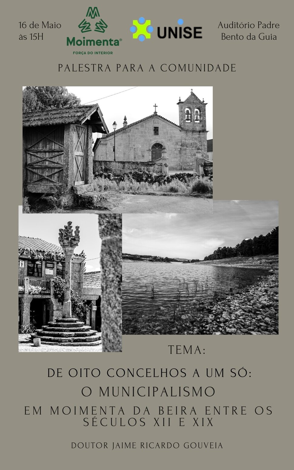 No dia 16 de maio às 15h00 o Auditório Municipal Padre Bento da Guia recebe a palestra "De oito concelhos a um só: O municipalismo em Moimenta da Beira entre os séculos XII e XIX" apresentada por Jaime Ricardo Gouveia.