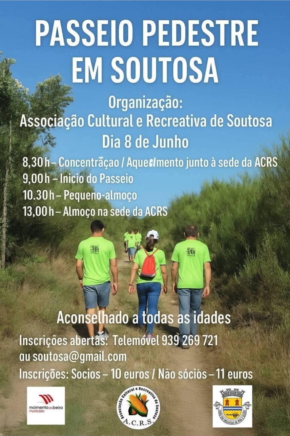 Soutosa vai organizar no próximo dia 8 de junho um passeio pedestre aberto a toda a comunidade. A iniciativa tem início às 08h30, com concentração e aquecimento junto à sede da Associação Cultural e Recreativa de Soutosa, seguindo-se o passeio às 09h00.