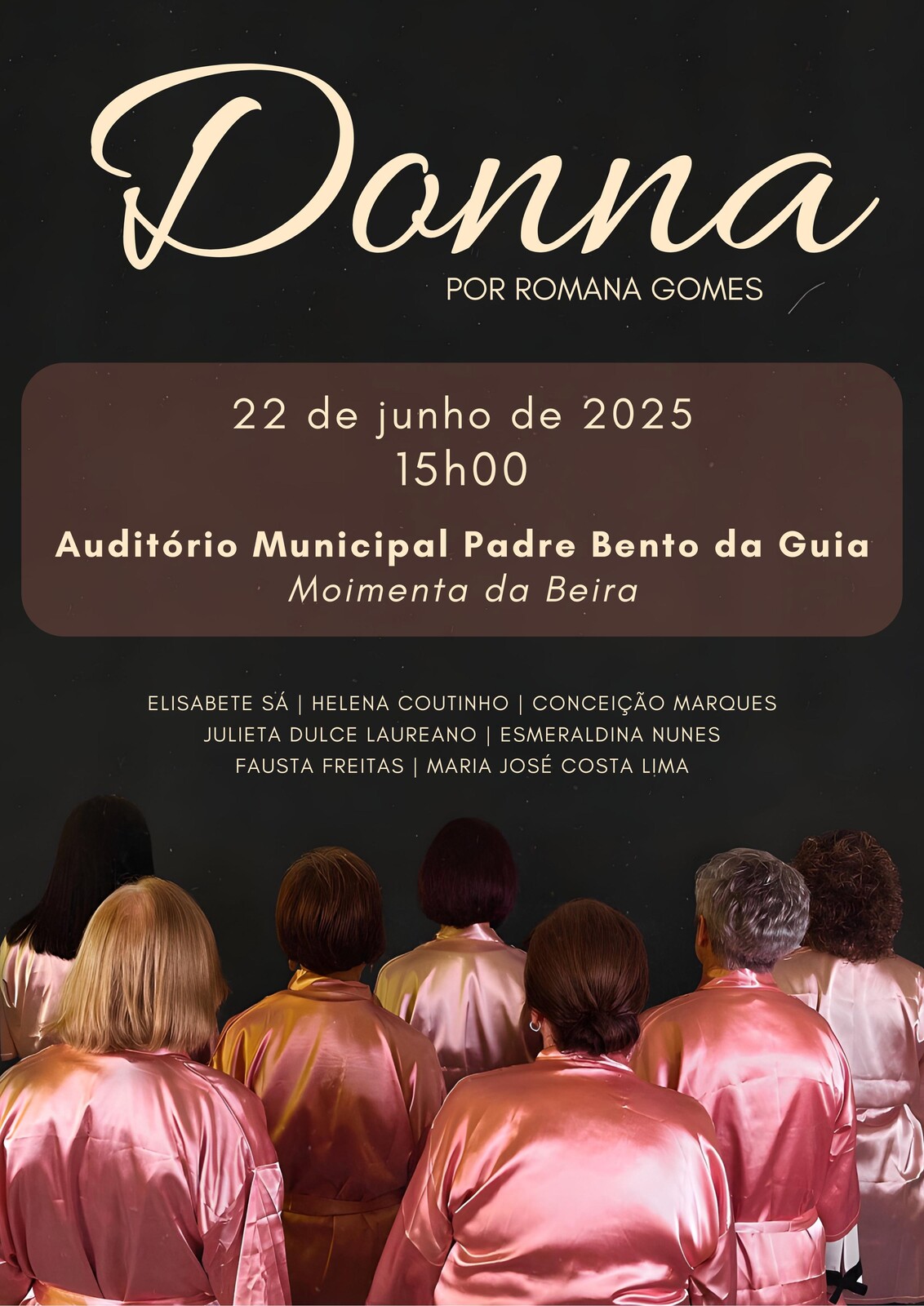 “Donna” é uma peça que aborda alguns dos desafios que a mulher enfrenta no processo de envelhecimento. Ao combinar música, teatro e movimento, “Donna” transporta-nos numa viagem íntima e reflexiva sobre a importância da autoestima e do autocuidado em qualquer idade. Esta peça conta com a participação de 7 mulheres, com idades compreendidas entre os 50 e os 80 anos.