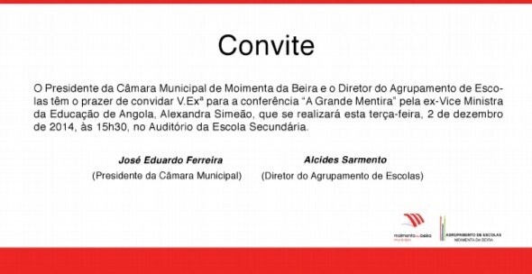Alexandra Simeão, ex-vice ministra da educação de Angola, dá esta terça-feira (15h30), 2 de dezembro, em Moimenta da Beira, no auditório da Escola Secundária, uma conferência que intitulou de “A Grande Mentira”. A entrada é livre.