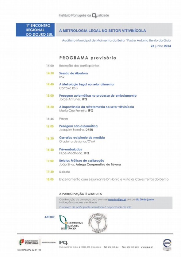 O Instituto Português da Qualidade vai realizar em Moimenta da Beira, no próximo dia 26 de junho, o 1º Encontro Regional Douro Sul “A metrologia legal no setor vitivinícola” em colaboração com a Cooperativa Agrícola do Távora e a Comissão Vitivinícola Regional Távora-Varosa.