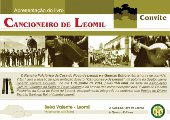 O reportório musical do Rancho Folclórico da Casa do Povo de Leomil, constituído por 36 músicas, acaba de ser reunido no “Cancioneiro de Leomil”, livro da autoria de Jaime Ricardo Teixeira Gouveia que vai ser lançado este domingo, 1 de junho, às 15 horas, na sede da Associação Cultural Valentes da Beira, em Beira Valente, Leomil, Moimenta da Beira. A obra tem prefácio da Federação do Folclore Português e nota introdutória de Alberto Correia intitulada "A alma de um povo numa canção".