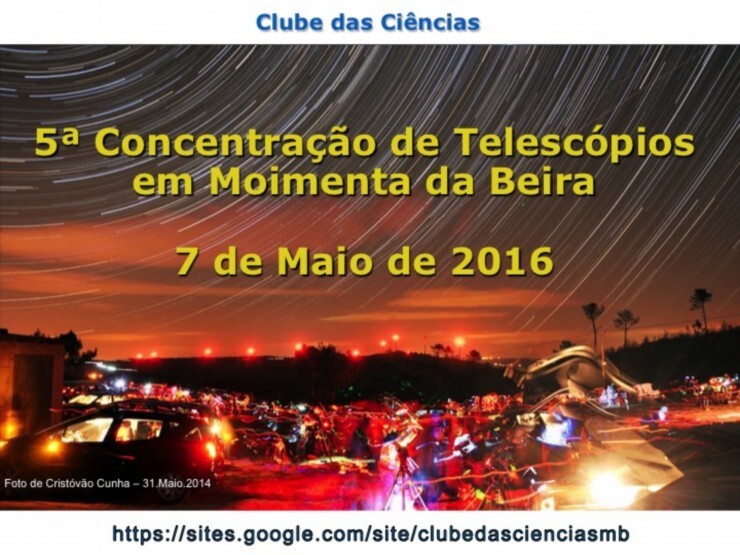 Já tem programa fechado e pré-inscrições abertas. É a maior concentração de telescópios do país e realiza-se em Moimenta da Beira nos dias 7 e 8 de maio de 2016, pelo quinto ano consecutivo, sempre com enorme sucesso. A organização é do “Clube das Ciências” do Agrupamento de Escolas de Moimenta da Beira, fundado por Paulo Sanches, professor da escola, criador do evento e a sua alma-maior.
