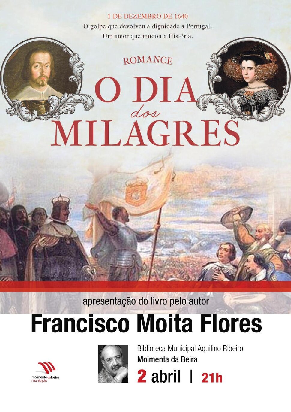 O escritor, antigo inspetor da Polícia Judiciária e ex-presidente da Câmara de Santarém, Francisco Moita Flores, apresenta no dia 2 de abril, às 21 horas, na Biblioteca Municipal Aquilino Ribeiro, em Moimenta da Beira, o seu livro “O Dia dos Milagres”, um romance histórico, apaixonante, que conta os dias vividos por D. João IV e Luísa de Gusmão, quando preparam o golpe que haveria de conduzir à Restauração em 1 de Dezembro de 1640.