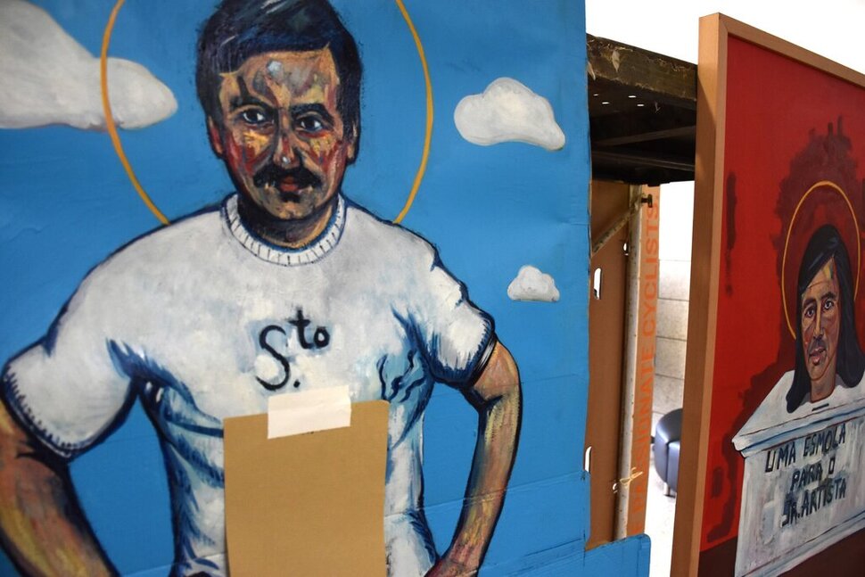 A instalação é ousada. Três pinturas num andaime e cartão usado, a que se junta alguma iconografia religiosa. O Sto. Artista principal, pintado sobre cartão, vestido como um desportista, remete para um jogador de futebol, tem uma auréola, e ao fundo da tela, há uma mão de cera e uma caixa para as esmolas. Do outro lado, há outras duas pinturas, igualmente concebidas por este artista, responsável por vários ateliês e oficinas de artes plásticas, que diz ter-se inspirado no pai para os rostos dos “stos”.
