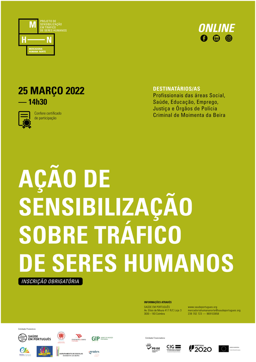 É uma ação de Sensibilização sobre Tráfico de Seres Humanos para profissionais estratégicos/as das áreas Social, Saúde, Educação, Emprego, Justiça e Órgãos de Polícia Criminal do concelho de Moimenta da Beira.