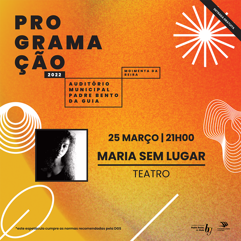 “Maria sem lugar”, peça de teatro, interpretação de Neide Simões, texto de André Pereira. A Neide é apaixonada por palco e por palavras. Começou a fazer teatro aos cinco anos e nunca mais o largou. O espetáculo é de entrada gratuita, mas obriga ao levantamento do bilhete de ingresso na Biblioteca Municipal Aquilino Ribeiro, durante a próxima semana.