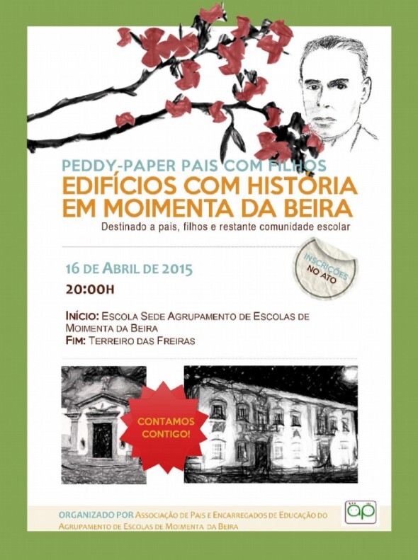 A Associação de Pais e Encarregados de Educação do Agrupamento de Escolas de Moimenta da Beira promove na próxima quinta-feira, 16 de Abril, a partir das 20 horas, um peddy-paper para pais, filhos e restante comunidade escolar, com percurso pelo centro histórico da vila, sede de concelho, e visita aos seus monumentos mais emblemáticos.