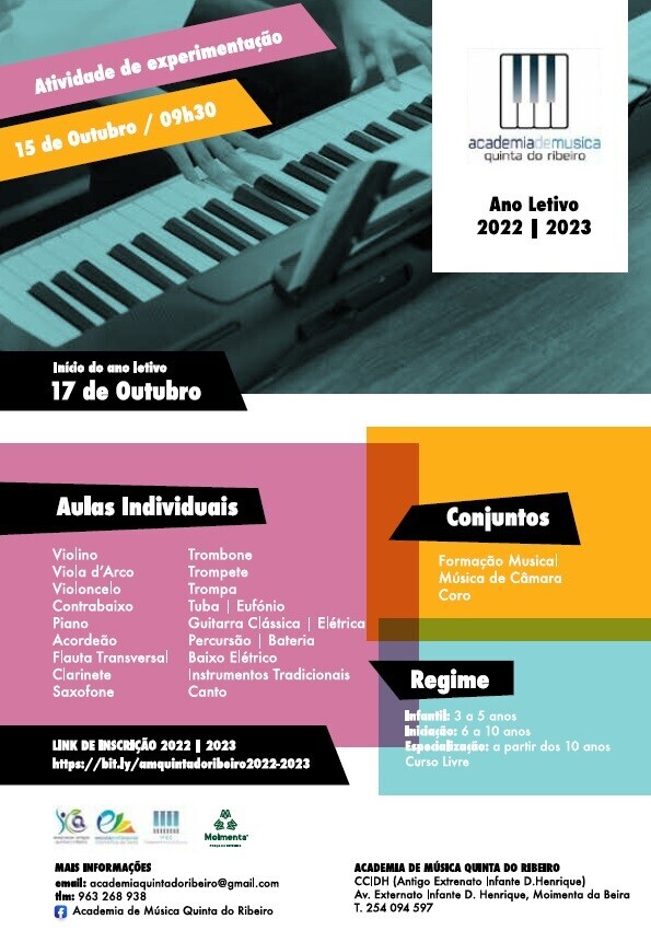 A Academia de Música Quinta do Ribeiro, em Moimenta da Beira, vai realizar no próximo sábado, 15 de outubro, uma aula aberta, e gratuita, a todas as pessoas (pequenos e graúdos) que sintam curiosidade pela música e queiram experimentar um instrumento musical. A atividade decorrerá na Escola Infante D. Henrique (Antigo Externato), a partir das 9h30.