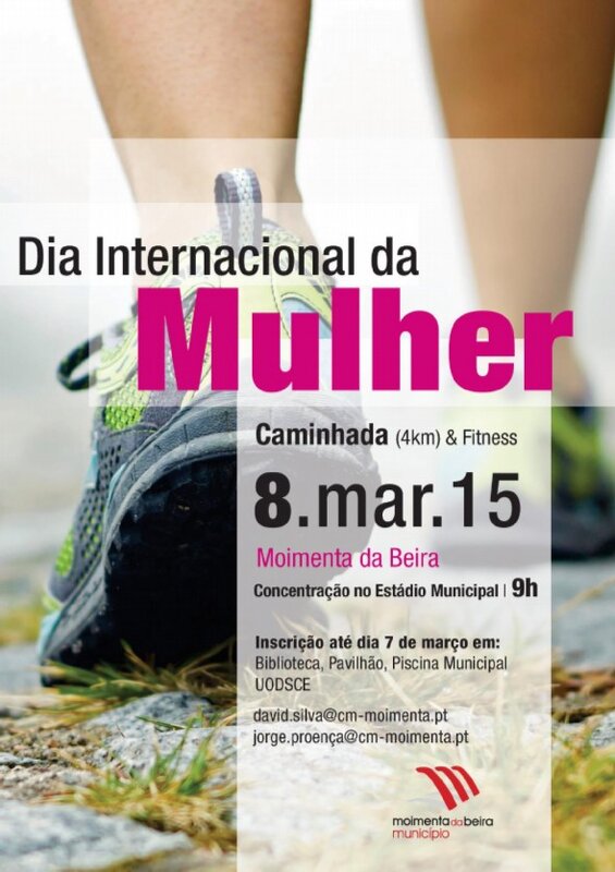 No domingo, 8 de março, Dia Internacional da Mulher, o município de Moimenta da Beira celebra a efeméride promovendo uma caminhada urbana e uma mega-aula de fitness, iniciativas abertas aos cidadãos em geral, sem distinção de sexos. As inscrições estão abertas até à véspera, sábado, 7 de março, na Biblioteca Municipal (254 520 080), pavilhão (254 521 002), piscina (254 529 161) e UODSCE (254 520 074) ou para os e-mails david.silva@cm-moimenta.pt e Jorge.proenca@cm-moimenta.pt.