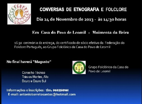 O Rancho Folclórico da Casa do Povo de Leomil recebe este domingo à tarde, 24 de Novembro, o diploma de sócio efectivo da Federação do Folclore Português (FFP). A cerimónia de entrega decorrerá no salão nobre da Casa do Povo, no fim das jornadas “Conversas de Etnografia e Folclore” que terão início às 14h30 e que consistirão numa exposição-debate entre o presidente da FFP e os representantes dos grupos federados e não federados presentes.