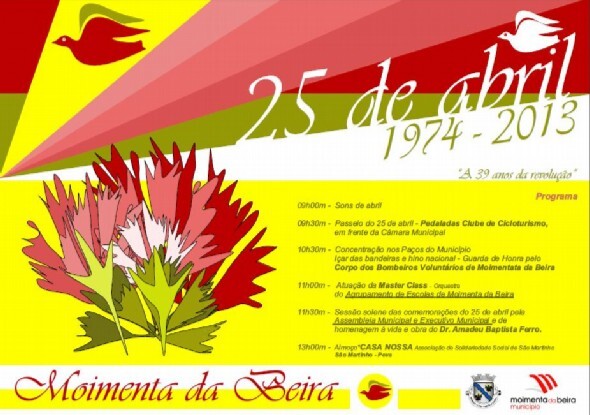 O programa inclui ainda “Sons de Abril”, música ambiente (de intervenção) a partir das 9h00. Meia hora depois, é o início do Passeio do 25 de Abril organizado pelo “Pedaladas – Clube de Cicloturismo de Moimenta da Beira. Às 10h30, cerimónia do içar das bandeiras e hino nacional nos Paços do Município, com guarda de honra pelo corpo de bombeiros voluntários de Moimenta. Às 11hh00, actuação da “Master Class”, orquestra de alunos e professores do Agrupamento de Escolas. O almoço, que encerra as celebrações, será na “Casa Nossa”, associação de solidariedade social de S. Martinho, Peva.