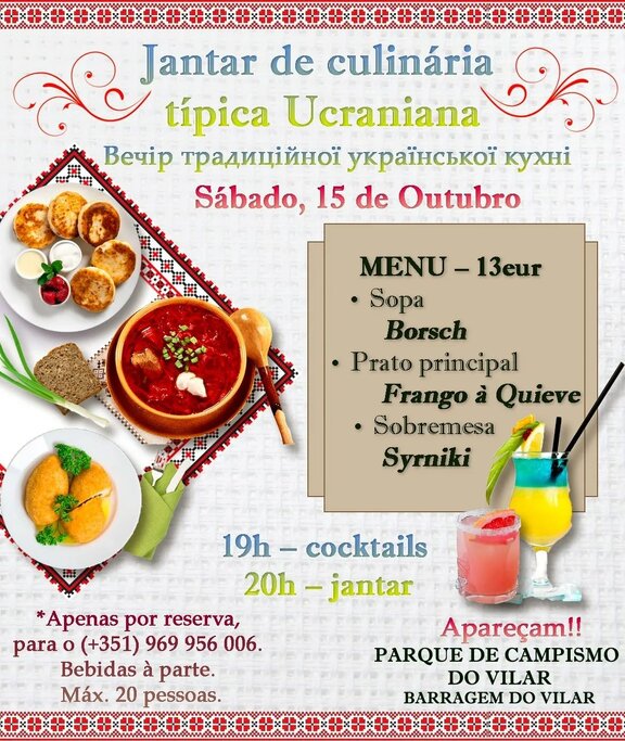 A sopa é ‘Borsch’, o prato principal ‘Frango à Quieve’ e a sobremesa ‘Syrniki’. Tudo sabores da Ucrânia que vão ser servidos à mesa do Parque de Campismo do Vilar da Barragem de Vilar, Moimenta da Beira, sábado, 15 de outubro. A hora do jantar está marcada para as 20h00, mas às 19h00 servem-se cocktails. É necessário reserva (969 956 006), para uma lotação máxima de 20 pessoas.