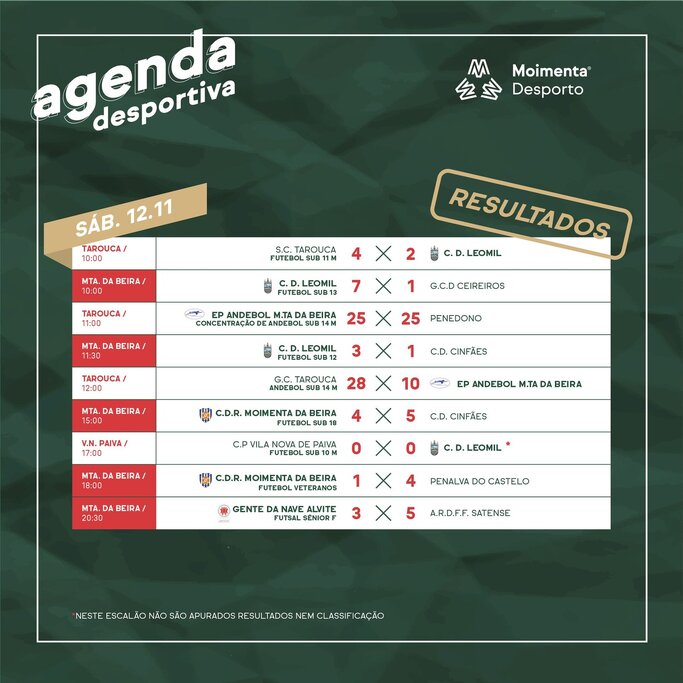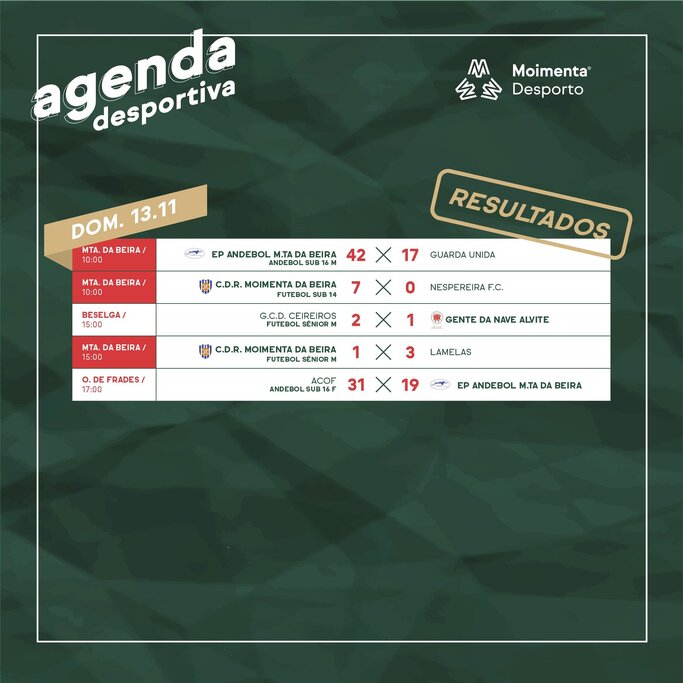 Ficam aqui os resultados oficiais do fim-de-semana desportivo.