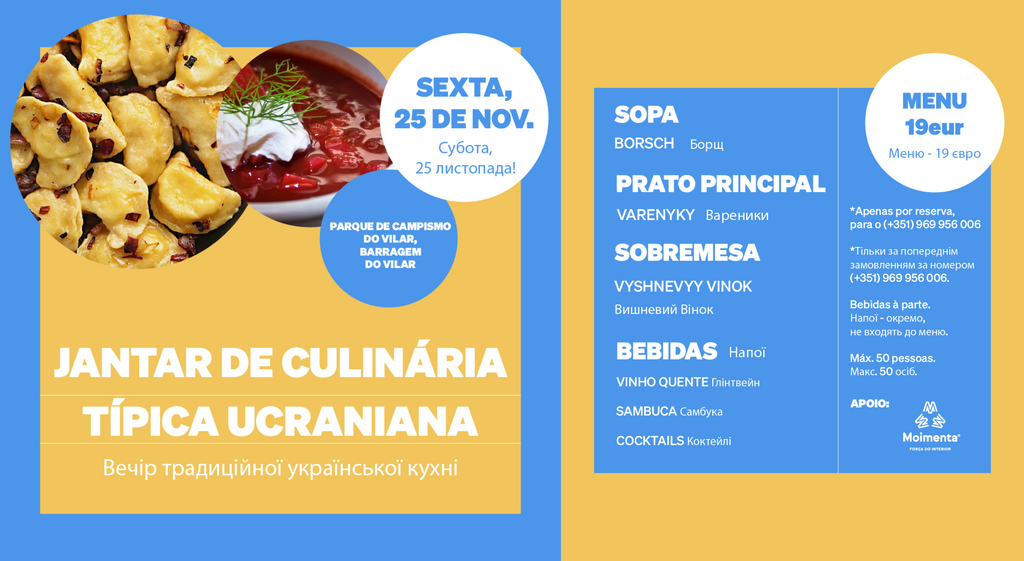 É mais um jantar de gastronomia típica ucraniana que vai decorrer no dia 25 de novembro, no Parque de Campismo do Vilar, na Barragem de Vilar, Moimenta da Beira. O evento, com o apoio do Município de Moimenta da Beira, terá início às 19 horas com o serviço de cocktails e às 20 horas será servido à mesa o jantar com o seguinte cardápio: uma sopa ‘Borsch’, um prato principal Varenyky e ainda a sobremesa Vyshnevyy Vinok’. Tudo acompanhado por vinho quente, sambuca e cocktails.