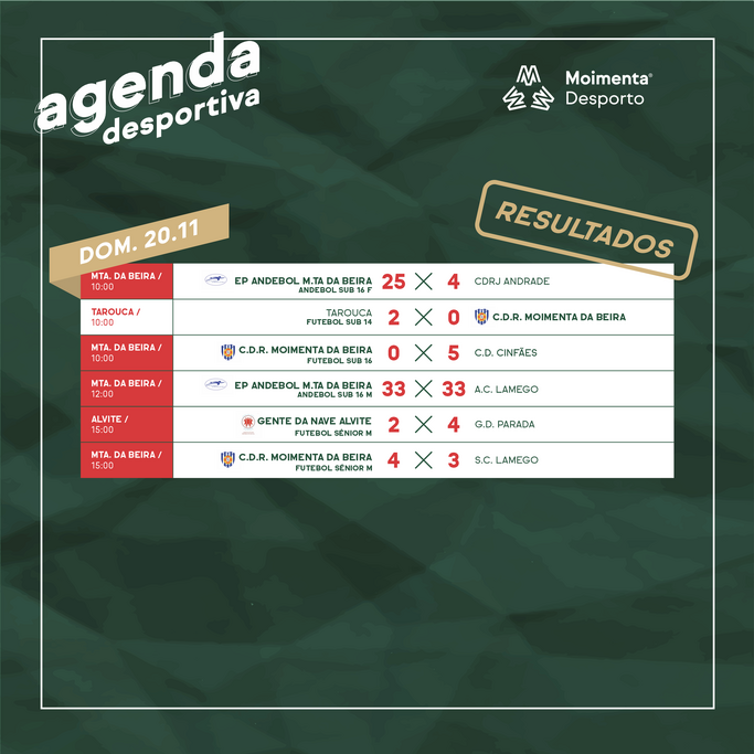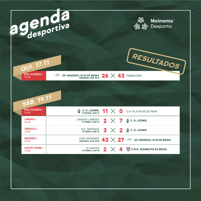 Entre vitórias e derrotas! Assim foi o fim-de-semana dos jogos oficiais que envolveram clubes do concelho de Moimenta da Beira de várias modalidades e faixas etárias, masculinos e femininos.