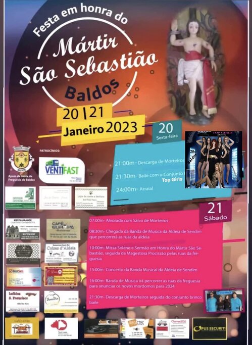 O cartaz já está na rua e promete alegria, muita animação e ainda celebrações religiosas! São as festas em honra do padroeiro Mártir São Sebastião, que vão decorrer nos dias 20 e 21 de janeiro, já esta sexta e sábado, na aldeia de Baldos, concelho de Moimenta da Beira.