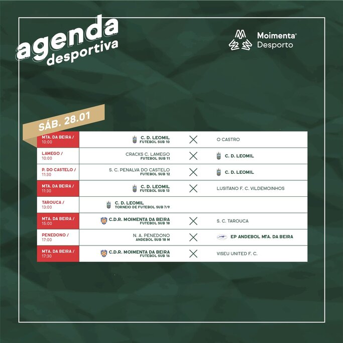 Seis jogos em casa e seis no reduto do adversário. É o calendário desportivo deste fim-de-semana, que conta com um Torneio de Futebol SUB-7/SUB 9 do Clube Desportivo de Leomil.
