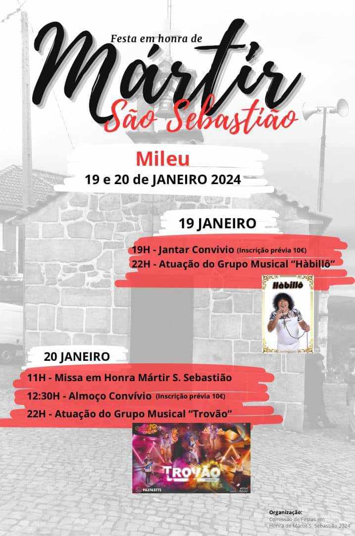 Já está na rua o cartaz da festa em honra de Mártir S. Sebastião, em Mileu, Moimenta da Beira. O programa de dois dias tem início na próxima sexta-feira, 19 de janeiro, pelas 19 horas, com um jantar convívio, e continuará com a atuação do grupo musical Hàbillô, às 22 horas.