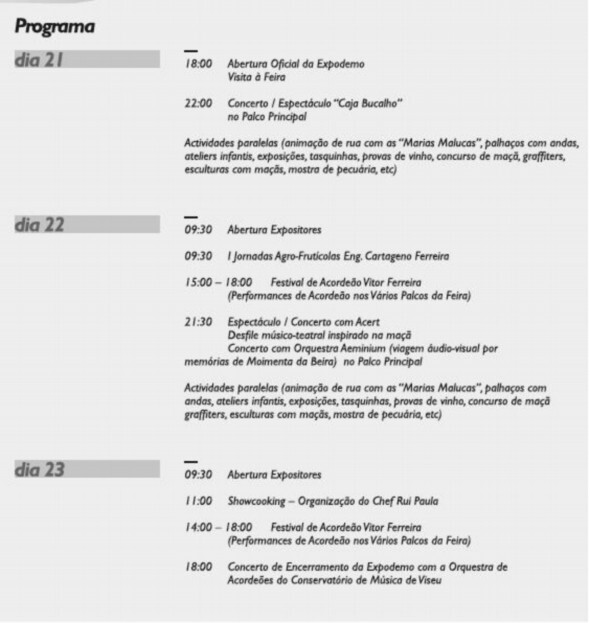 O certame é inaugurado esta sexta-feira, 21 de Setembro, às 18 horas, junto aos Paços de Concelho de Moimenta da Beira, e prolonga-se pelo fim-de-semana. São três dias de festa, três dias de animação em três palcos dispersos pelo recinto. Está convidado a aparecer e a participar da folia.