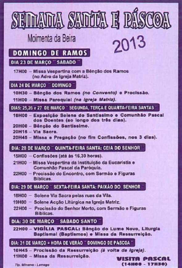 Aí está a Semana Santa da Páscoa 2013, que Moimenta da Beira vive sempre com muita intensidade. É uma tradição que se repete todos os anos Tem início este sábado, 23 de Março, com uma missa vespertina e bênção de ramos, no adro da igreja matriz, e termina no último dia de Março, domingo de Páscoa, com procissão da ressurreição, à volta da igreja, seguida da celebração.
