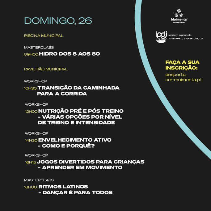 Duas masterclasses e quatro workshops vão preencher o programa da III Convenção de Desporto, Fitness + Saúde. A iniciativa, creditada pelo Instituto Português do Desporto e Juventude (IPDJ - Instituto Português do Desporto e Juventude, I.P.) , vai decorrer ao longo do dia 26 de maio na piscina e no pavilhão municipal de Moimenta da Beira e está inserida num plano mais vasto da III edição da Week Demo Sport que realizar-se-á de 24 de maio a 2 de junho. O evento é organizado pela Câmara Municipal e visa contribuir para a saúde, o bem-estar e a qualidade de vida dos cidadãos.