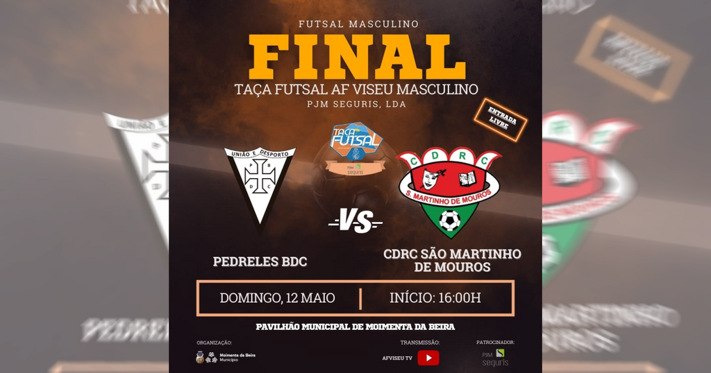 O Pavilhão Municipal de Moimenta da Beira vai acolher amanhã, domingo, 12 de maio, às 16 horas, a final da Taça de Futsal da AF de Viseu “PJM Seguris, Lda”, que coloca frente a frente as equipas masculinas do Pedreles BDC e do CDRC São Martinho de Mouros.