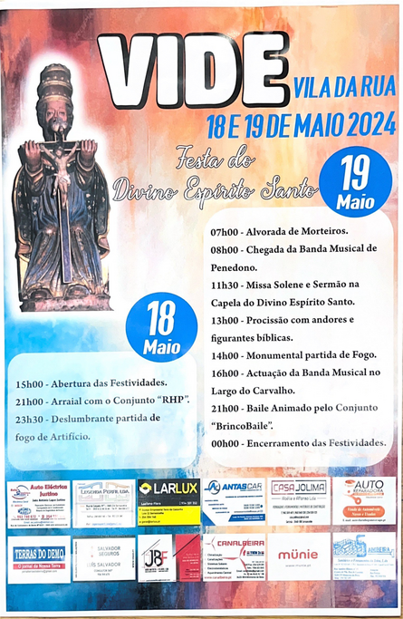 Já em Vide, Vila da Rua, o programa decorrerá também no fim-de-semana, mas só a 18 e 19 de maio. Durante os dois dias, o cartaz promete muita animação com os conjuntos musicais RHP e BricoBaile. O dia maior será domingo, com Missa Solene, Sermão e Procissão com andores e figuras bíblicas. Haverá atuação da Banda Musical de Penedono e também fogo-de-artifício.