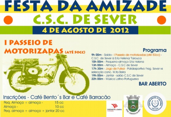 É mais um passeio de motoretas, motorizadas ou ciclomotores, desta vez em Sever, sábado, 4 de Agosto, com partida às 9 horas. As inscrições já estão abertas e podem ser feitas no ‘Café Bento’s Bar e “Café Barracão’ ou através dos telefones 938 636 576 e 935 821 501. A organização é do Centro Social e Cultural de Sever mas a Junta de Freguesia da terra e a Câmara Municipal de Moimenta da Beira colaboram também.