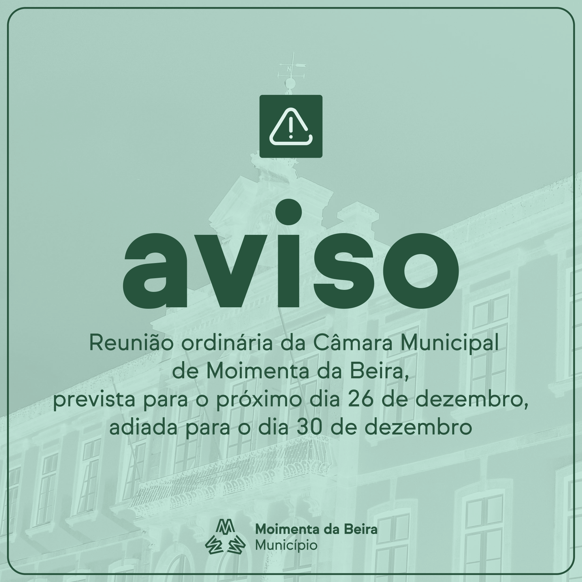 Após auscultação favorável de todos os membros do Órgão Executivo, comunica-se que a próxima reunião ordinária da Câmara Municipal de Moimenta da Beira, prevista para o próximo dia 26 de dezembro, foi adiada para o dia 30 de dezembro de 2024, pelas 14h30, no Salão Nobre do Edifício da Câmara Municipal.
