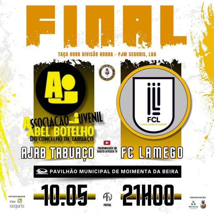 Mais tarde, às 21 horas, entrarão em campo as formações masculinas da AJAB de Tabuaço e do FC de Lamego para jogar a Final da Taça de Ouro da Divisão de Honra – PJM Seguris, Lda. Os dois encontros têm entrada livre e serão transmitidos em direto na AF Viseu TV.