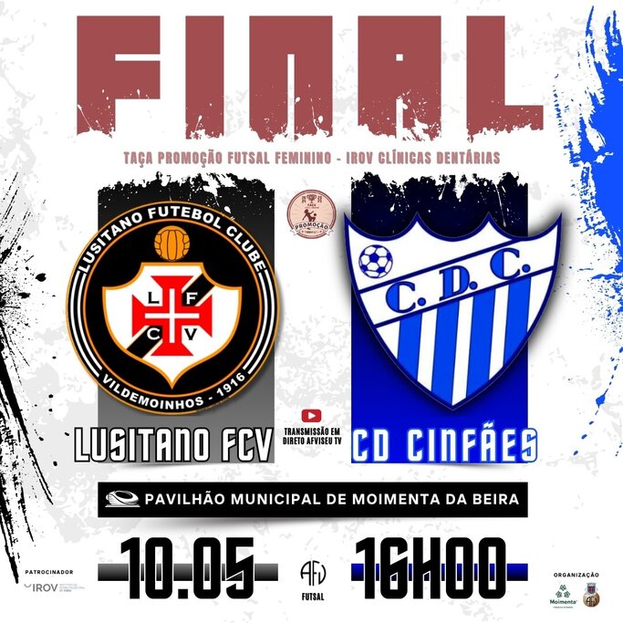 Já pelas 16 horas, realizar-se-á a primeira final do dia. As equipas do Lusitano FCV e do CD de Cinfães medirão forças na Final da Taça Promoção Futsal Feminino – IROV Clínicas Dentárias.