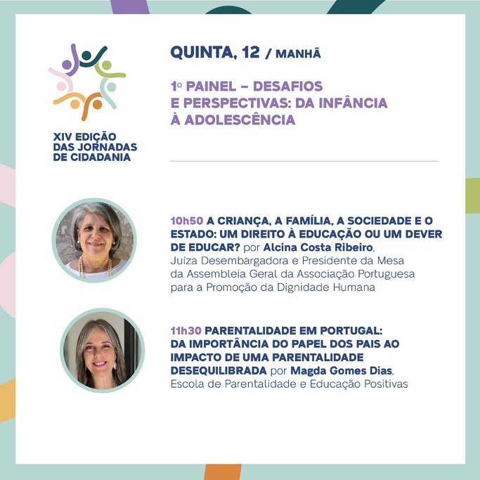 10h50 – A criança, a família, a sociedade e o Estado: Um direito à educação ou um dever de educar? por, Alcina Costa Ribeiro, Juíza Desembargadora e Presidente da Mesa da Assembleia Geral da Associação Portuguesa para a Promoção da Dignidade Humana.