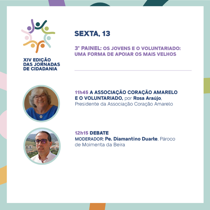 No dia seguinte, 13 de junho, o terceiro painel “Os jovens e o voluntariado: uma forma de apoiar os mais velhos” iniciará com a atuação do Grupo de Cavaquinhos da Universidade Sénior Infante D. Henrique. Logo a seguir haverá tempo para três intervenções e por fim um debate. Neste segundo dia, o Vereador com o pelouro da Cidadania, Educação e Migrações, Hugo Bondoso, encerrará as jornadas às 12h30, dia em que o Chefe de Divisão do Desenvolvimento Social da Autarquia, Ricardo Castro, dará as boas-vindas.