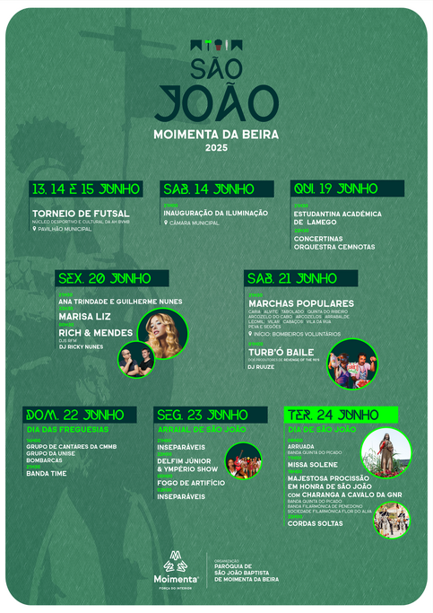 Moimenta da Beira prepara-se para viver dias intensos com as celebrações do São João 2025. O evento, organizado pela Paróquia de São João Baptista de Moimenta da Beira, decorrerá entre os dias 13 e 24 de junho, com um programa diversificado, que junta desporto, cultura, tradição e grandes espetáculos musicais, que promete atrair milhares de visitantes à vila.