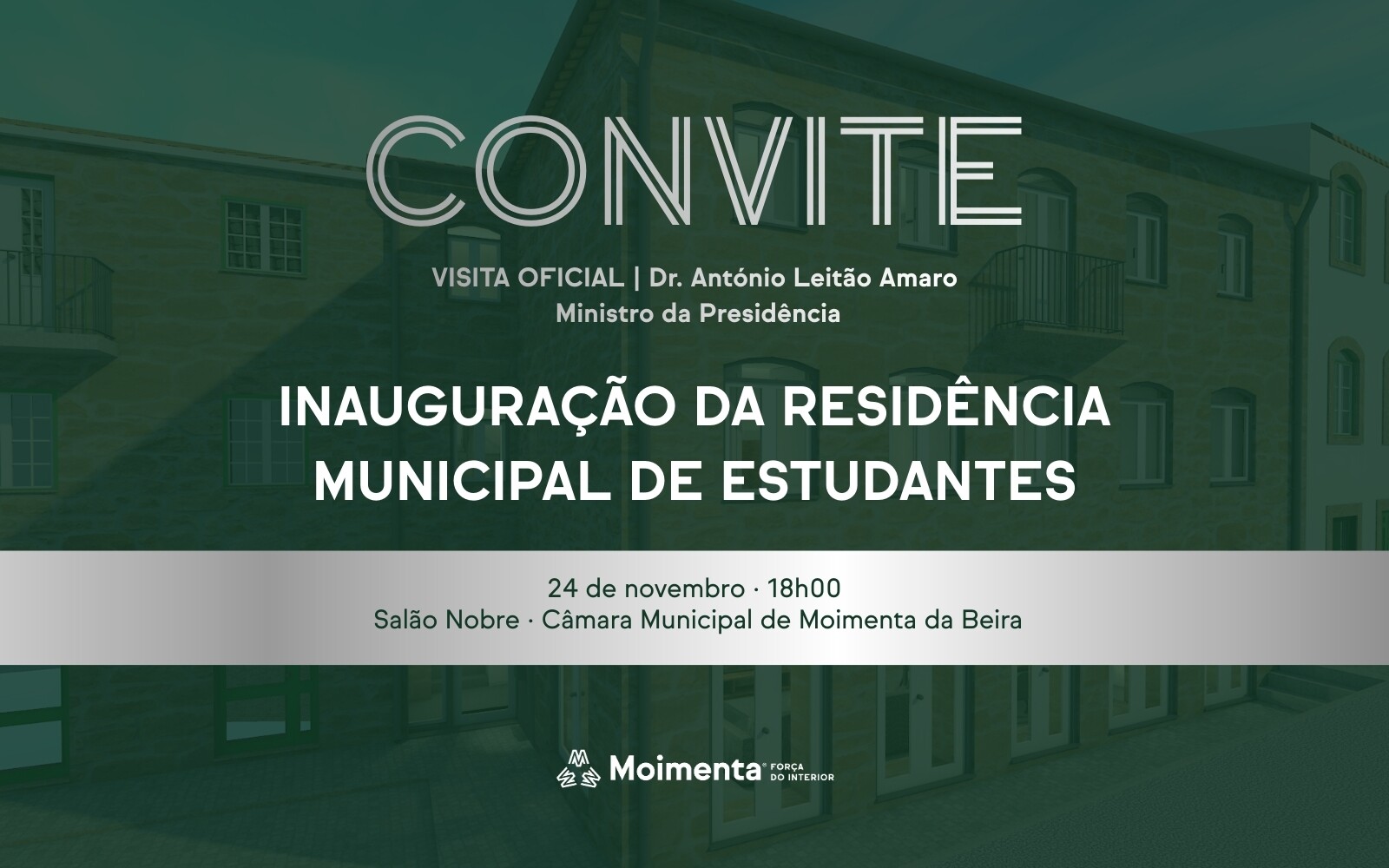 O Ministro da Presidência, Dr. António Leitão Amaro, visita Moimenta da Beira no próximo dia 24 de novembro para inaugurar a nova Residência Municipal de Estudantes do Ensino Superior, um investimento estratégico que reforça as condições de acolhimento, fixação e apoio aos jovens que prosseguem estudos fora do concelho.