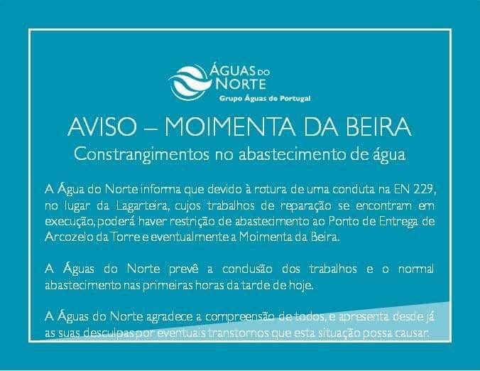 A Câmara Municipal de Moimenta da Beira, que é completamente alheia a esta penosa ocorrência, lamenta todos os incómodos e informa que a reposição do abastecimento de água pode não acontecer antes das 22 horas de hoje.