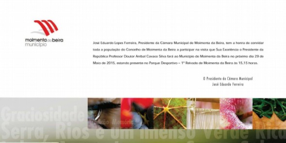 Nesse sentido, o Presidente da Câmara Municipal de Moimenta da Beira, José Eduardo Ferreira, tem a honra de convidar toda a população do concelho a participar na visita de Sua Excelência o Presidente da República, estando presente, nesse dia, no Parque Desportivo (1º Relvado) às 15h15.