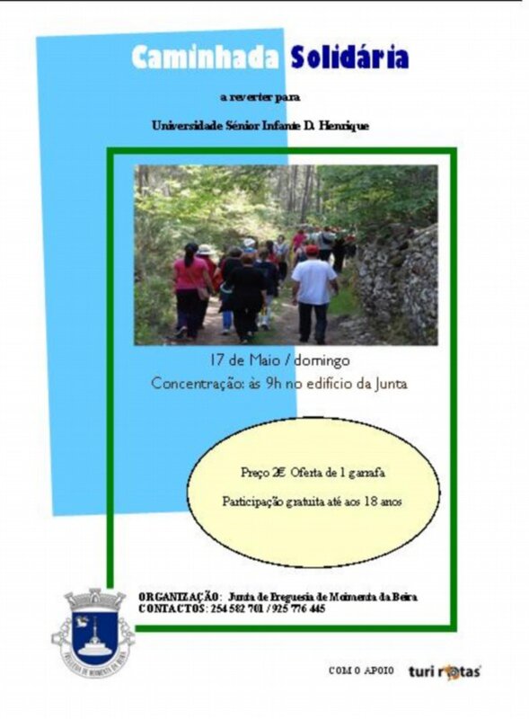Este domingo, 17 de maio, a partir das 9 horas, a Junta de Freguesia de Moimenta da Beira organiza mais uma caminhada solidária cujo valor da inscrição (dois euros) reverterá, desta vez, a favor da Universidade Sénior Infante D. Henrique. A participação é gratuita para os menores de 18 anos.
